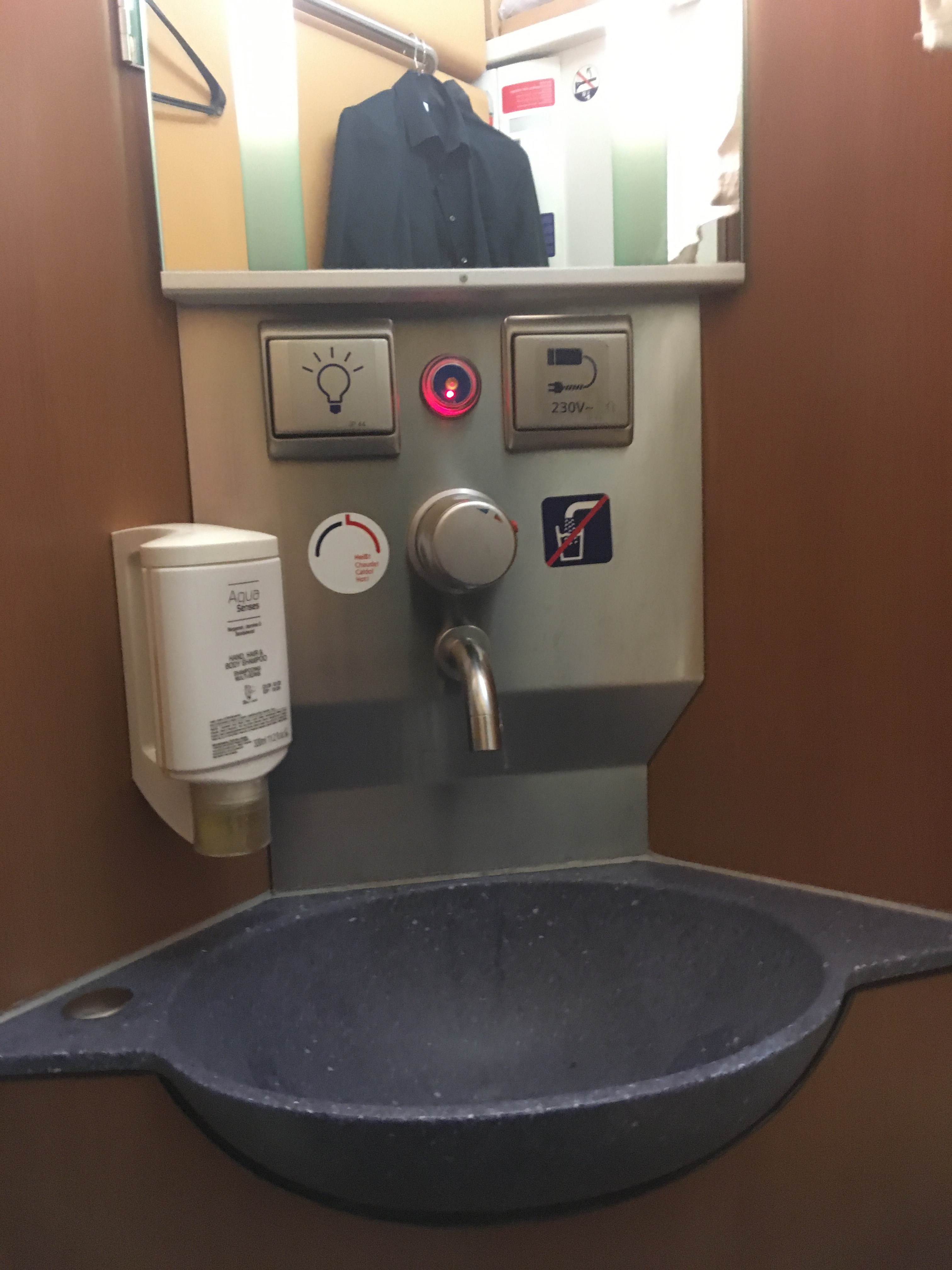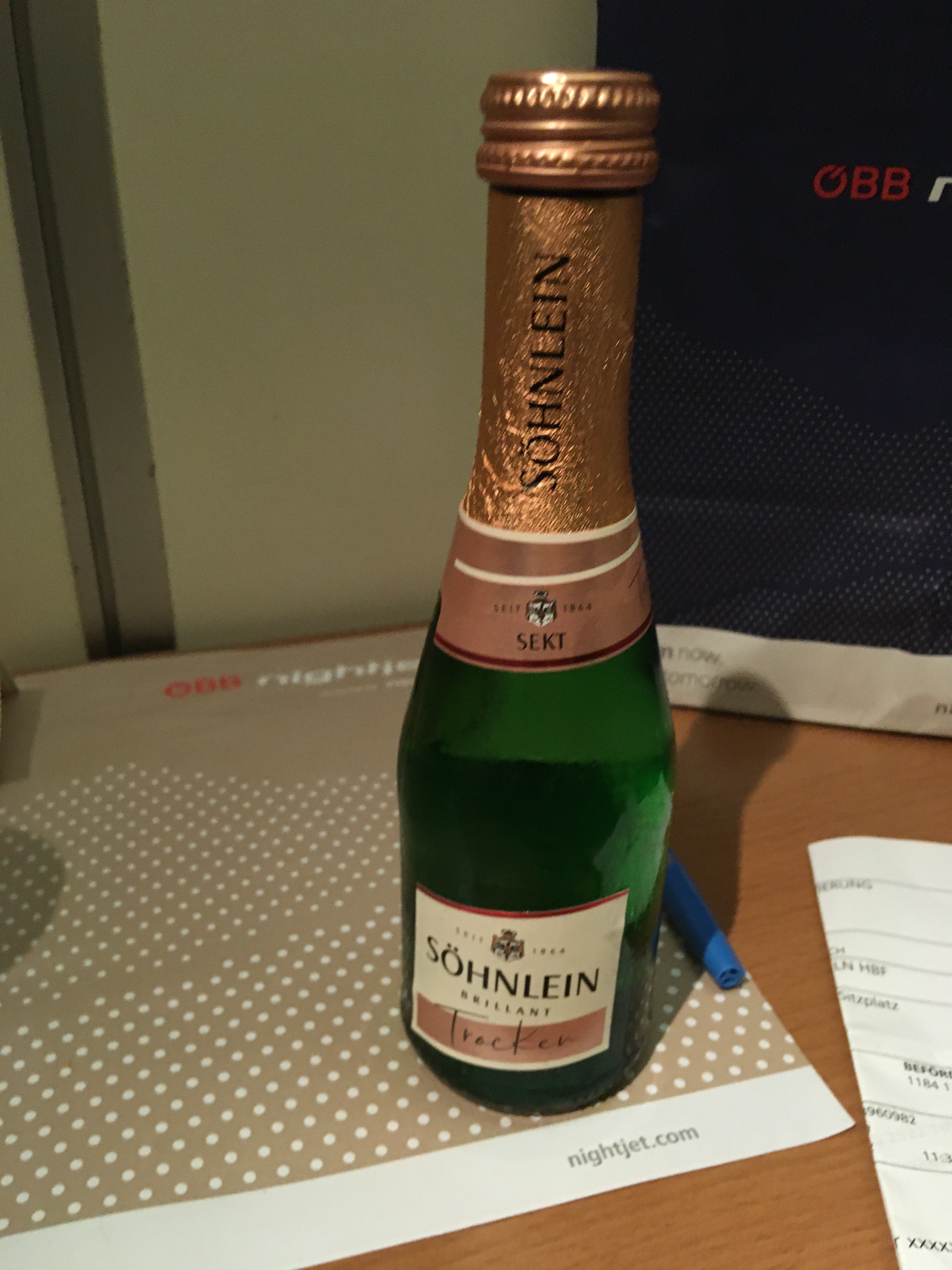 The sleeping car attendant came around with an overnight amenity kit, well stocked with a water bottle, slippers, a good quality washcloth and a small soap bar, ear plugs, a sleeping mask and a pen. The latter would have been nicer with some nightjet branding on it. He also offered me a free mini bottle of sparkling wine and some crackers to go with it.