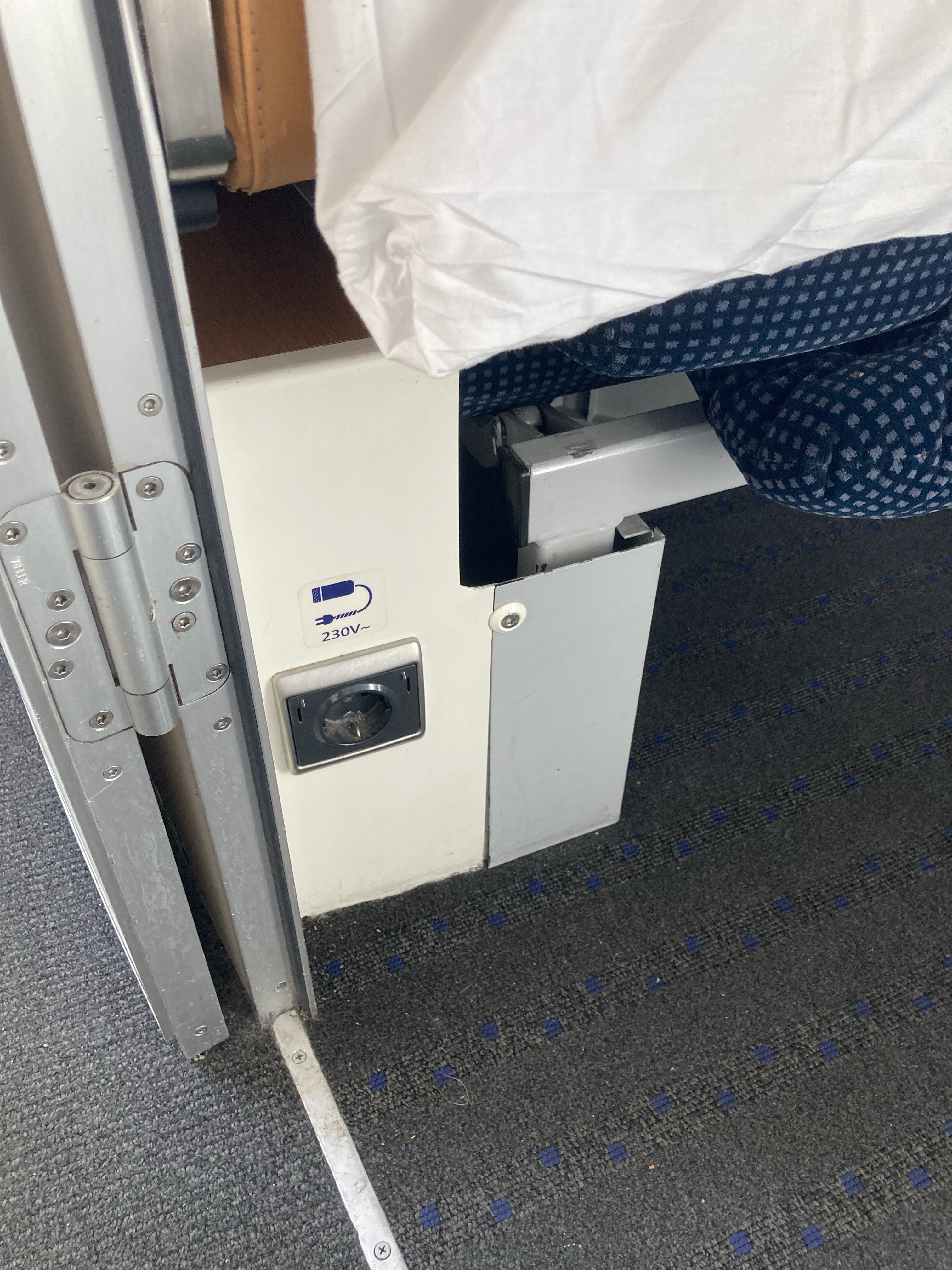 There is a cabinet with a washstand with a 230V power outlet located irritatingly close to a faucet that, contrary to the sticker, only dispensed cold water. There is another standard 230V power outlet located under the seat next to the aisle – pretty hard to find.